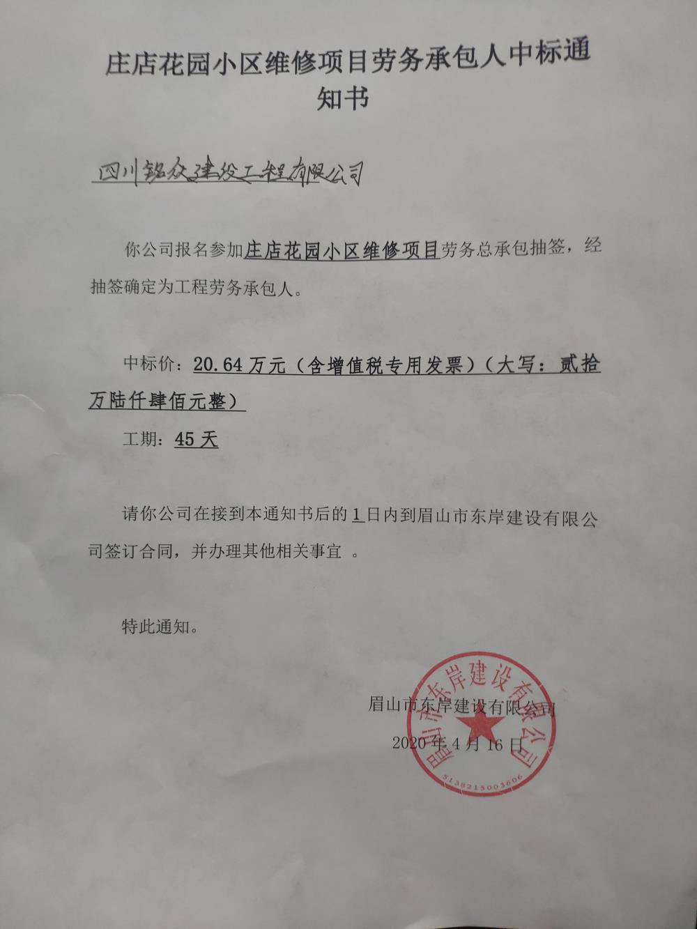 莊店花園小區(qū)維修項目中標(biāo)通知