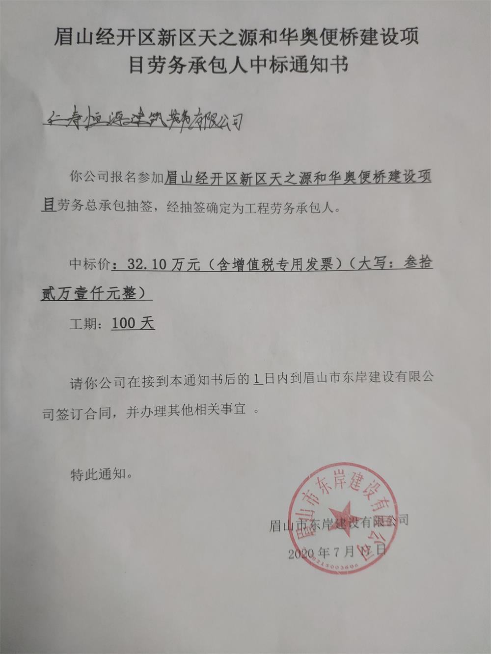 眉山經(jīng)開區(qū)新區(qū)天之源和華奧便橋建設(shè)項(xiàng)目中標(biāo)通知